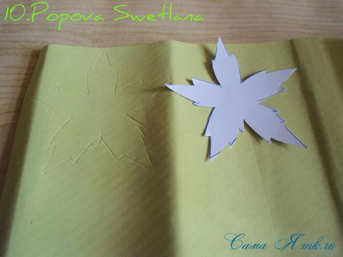 Под не приклеенный «лучик» подсовываем наши листочки и прокалывая проволокой серединку цветка, вставляем листочки, предварительно намазанные клеем.
