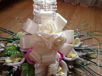 - Из капроновых лент нужно собрать два банта, приложить к ним цветок и привязать все тесьмой.