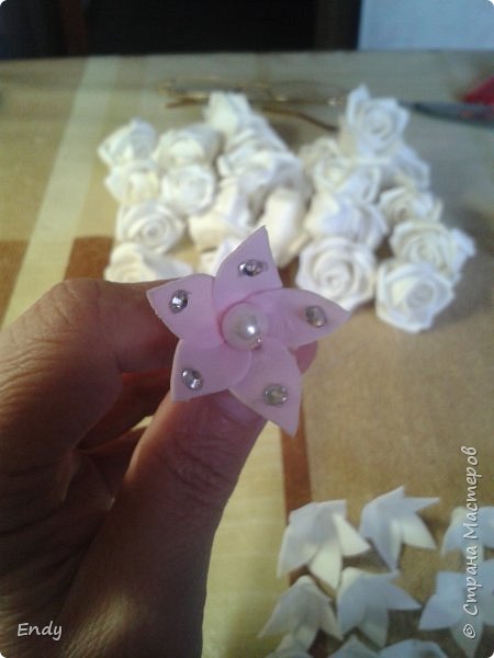 Чтобы цветок имел законченный вид в середину цветка приклеиваю или креплю на проволоку бусину, можно приклеить стразы.