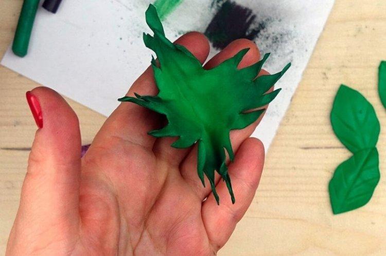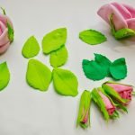 Когда закончишь, проволоку-стебель оберни зеленой лентой или узкой полоской фоамирана. Вырежи зеленые листья и подклейку-цветник, которые потом можно тонировать пастелью. Если у тебя есть молд или штамп, придай всем деталям фактуру, и точно так же разомни у утюга. Останется только дособрать розу на клеевой пистолет.