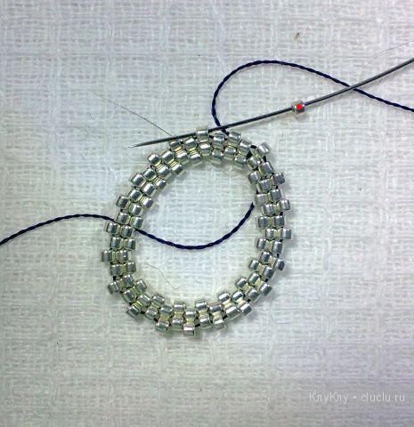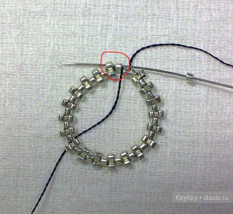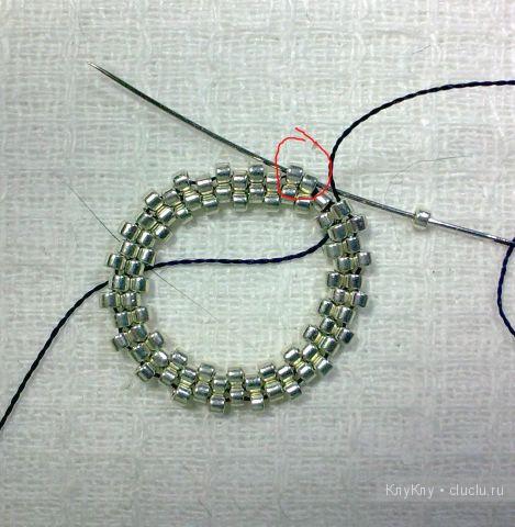 4. Третий ряд: Набираем 1 бисеринку “серебро”, проплетаем.