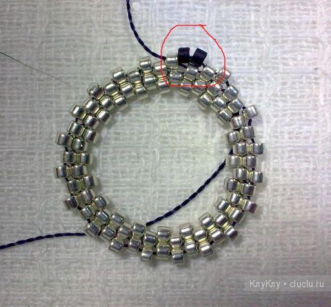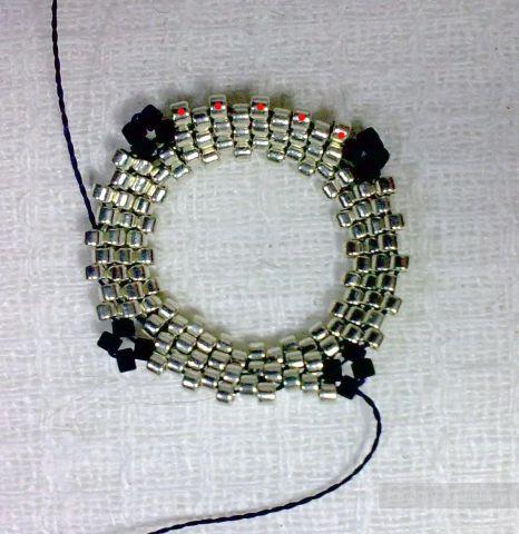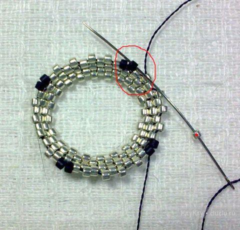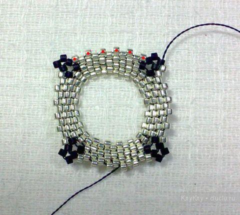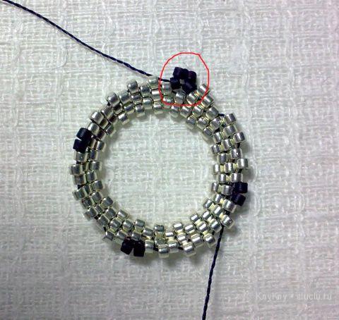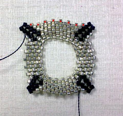 Далее чередуем 4 “серебро” / 2 черные. Между черными бисеринками 4 серебренных. В итоге 4 угла получаться с черными бисеринками.