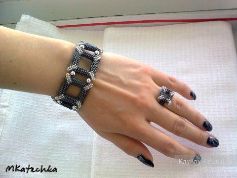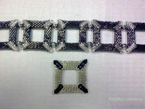 Очень красивый стильный браслетик из бисера, состоящий из серебряно-чёрных квадратов. Мастер класс довольно подробно описывает процесс плетения квадрата. Посмотрите и обязательно попробуйте сплести такой браслет! А в комплект к браслету можно сделать такое же колечко и серьги или колье.