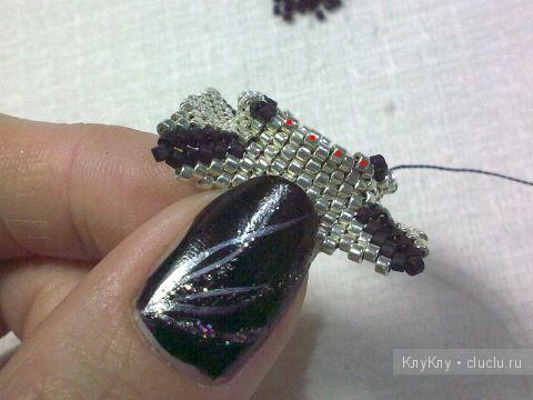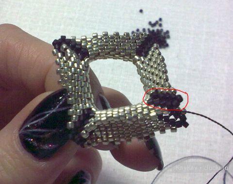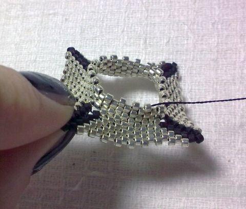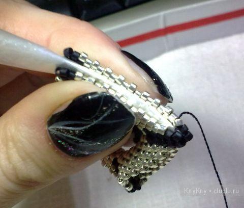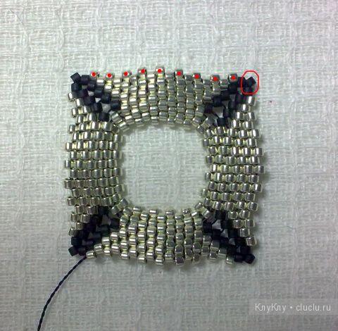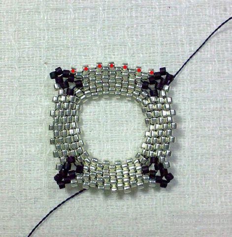 6. Пятый ряд: Между черными бисеринками уже 6 серебренных. Будущий квадрат в процессе “заворачивается”, это нормально, потом все на место “встанет”.