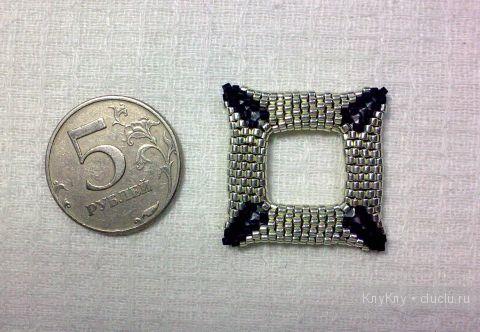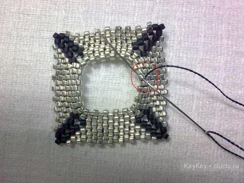 9. Последний ряд: Вместо 2-х черных плетем 1 черную бисеринку (так плетем только на этой стороне квадрата), между черными бисеринками уже 9 серебренных. Закрепляем нить, прячем, обрезаем. Первая сторона квадрата готова!
