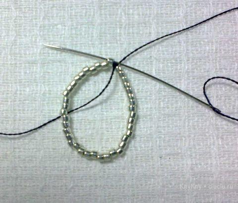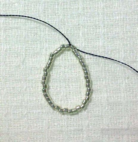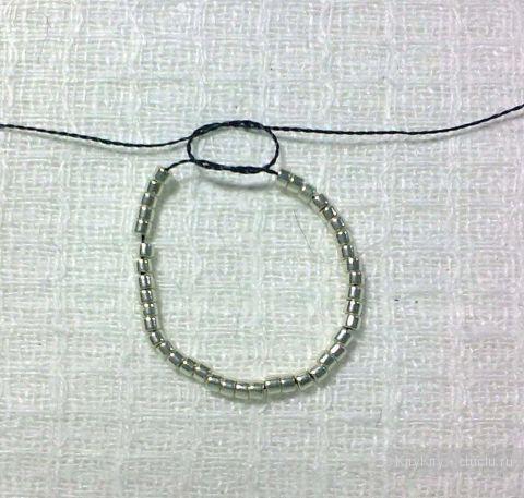 У нас в примере 4 раза чередуются 5 серебристых и 1 черная бисерины. Затем замыкаем низку в кольцо, расположив его посередине нити, т.к. будем использовать оба конца нити. Завязываем нить двойным узлом: