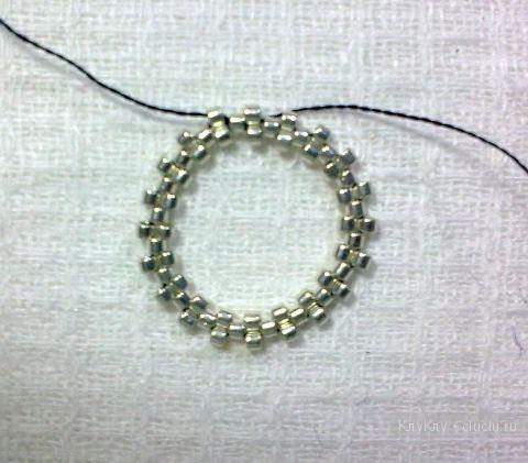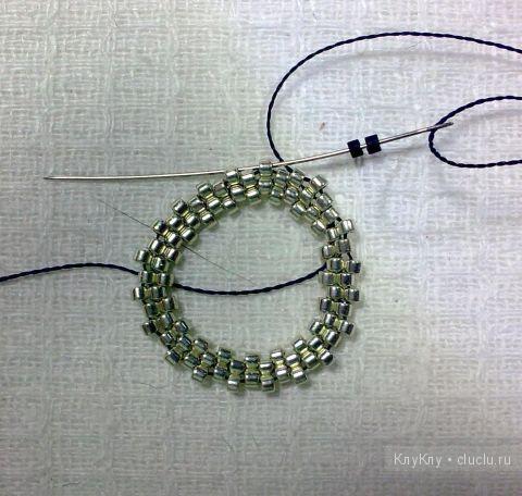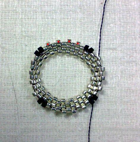 (Две бисерины дополнительного цвета + нечетное количество (в данном случае пять) единиц дополнительного цвета). И так четыре раза. Заключаем получившуюся цепочку в кольцо, пройдя через первую бисерину дополнительного черного цвета:
