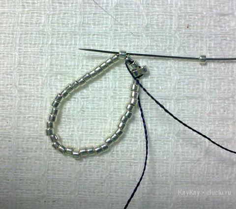 1. Набираем 40 бисеринок “серебро”, на середине нити делаем двойной узел, оставляем хвостик примерно 1 м (им будем ворую половинку квадрата плести).