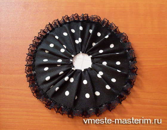 Ну и теперь, как вы догадались, нам нужно прикрепить кружок поменьше и кружок побольше, чтобы сформировалась настоящая цилиндрическая шляпка. Пусть вас не смущает качество шва или стыковки деталей, все изъяны задекорируем бусинами и тканью.