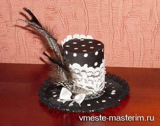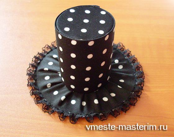 Теперь один из приятных этапов — декорирование шляпки. На цилиндр прикрепляем кусочек кружева, обшиваем бусинами, вот уже что-то и вырисовывается.