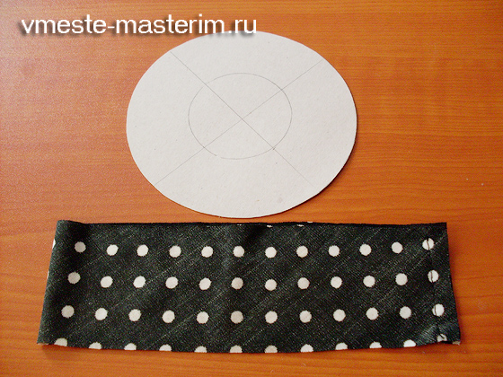 Приступаем к работе. Из фетра необходимо вырезать 5-сантиметровую полосочку в ширину и примерно 10 см в длину, а также два различных круга. Один круг — это будут поля вашей шляпки, а второй круг — его диаметр должен совпадать с получившимся кругом из вырезанной ленты.