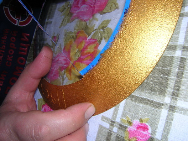 Кладем для непрозрачности еще парочку слоев золотого. Ждем высыхания. И снимаем фумленту. Поскольку на неё попало достаточное количество краски, чтобы при снятии эта краска не потянулась за ней, рекомендудую подрезать краску, канцелярским ножом.
