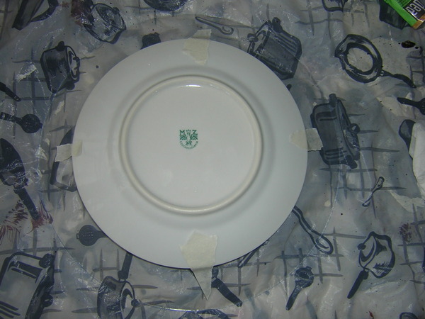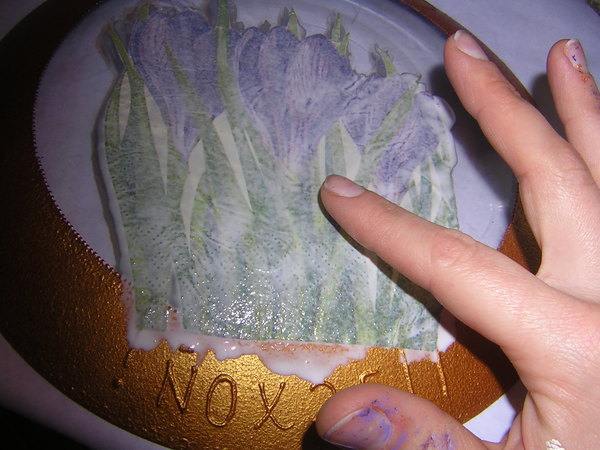 - Разводим клей ПВА с водой и промазываем картинку с лицевой стороны. Прикладываем к тарелке, лицом вниз.
