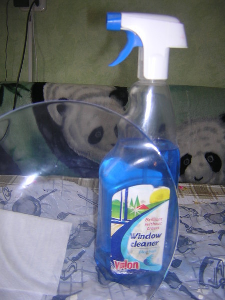 Берем стеклянную тарелку и жидкость для протирания стекол.