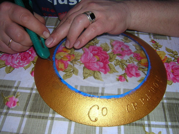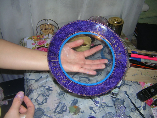 Поскольку вся краска у нас на обратной стороне и хорошо закрыта лаком, эту тарелку можно и даже нужно использовать как тарелку для кулича. Моя сестра точно пойдет с такой святить кулич в церковь.