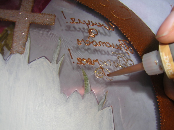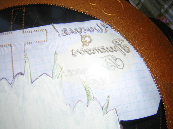 Подкладываем этой стороной под тарелку и обводим, сначала контуром с блестками.