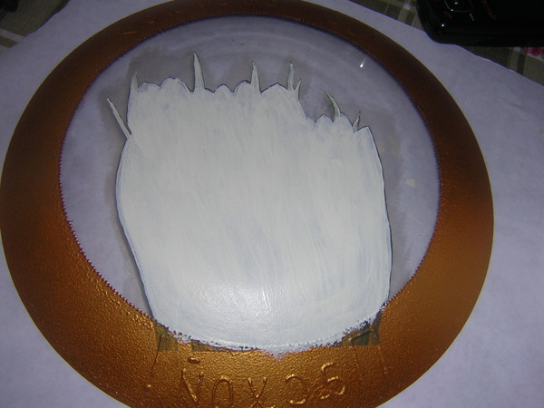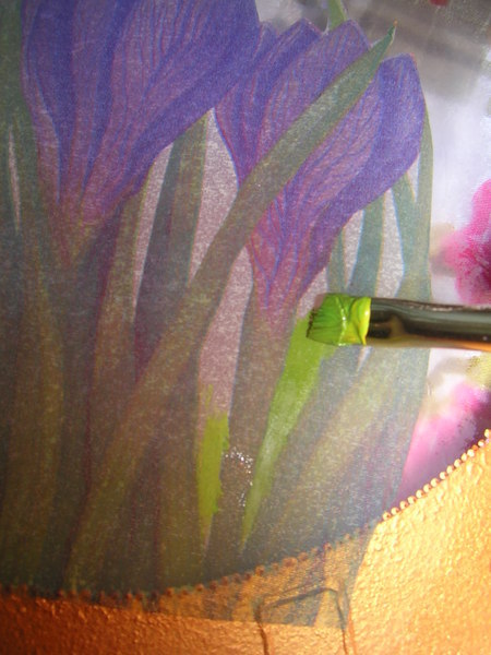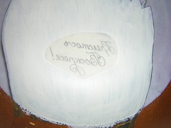 После того как лак просохнет, делаем мотив непрозрачным и насыщенным цветом. Покрываем его с обратной стороны белой краской. Я для этих целей пользуюсь белым акриловым грунтом. Но он у меня очень укрывистый.