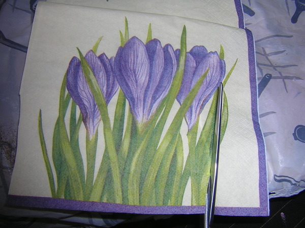 Далее берем салфетку, я взяла свою любимую, с подснежниками. последнюю (эх, не скоро еще поеду в Воронеж, где их дарят, замечательные воронежские девочки декупажницы:)