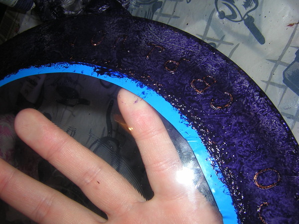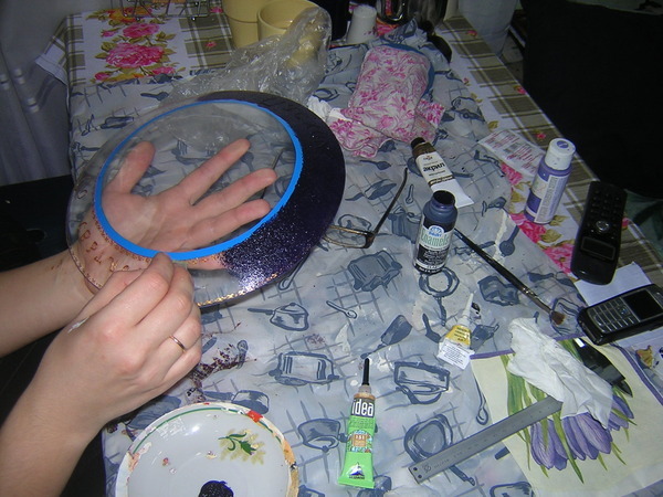 На этой тарелке я задумала сделать широкую фиолетовую кайму с очень красивым фоном. Для того чтобы отчертить ровно окружность, я на нашу тарелку сверху положила тарелку меньшего размера