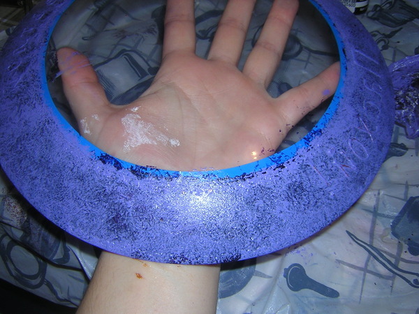 Берем фиолетовую краску и тампонированием наносим ее на ограниченную фумлентой кайму.