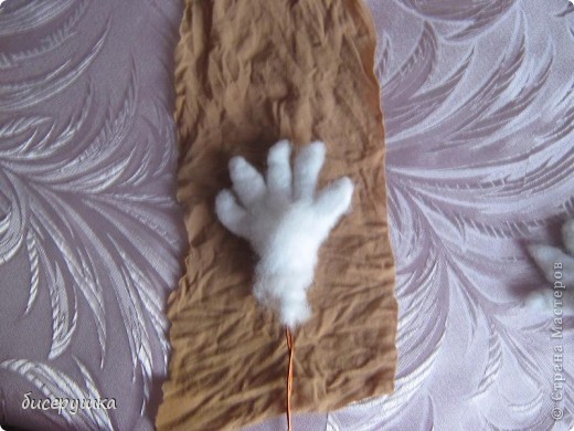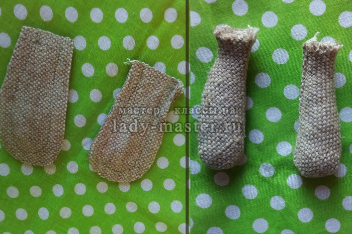 Осталось сшить для домовенка руки. Их делаю из мешковины по шаблону. Сшиваю на машинке и выворачиваю. Набиваю синтепоном.