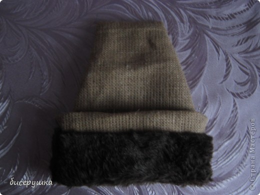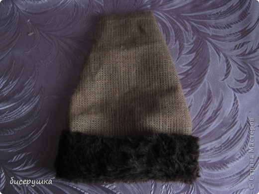 Шапка делается очень просто. Сшиваем из мешковины ещё один невысокий мешок. Ширину делаем такую, чтобы налез на голову. Делаем отворот и один из углов заламываем на бок и прикрепляем ниткой или клеем.