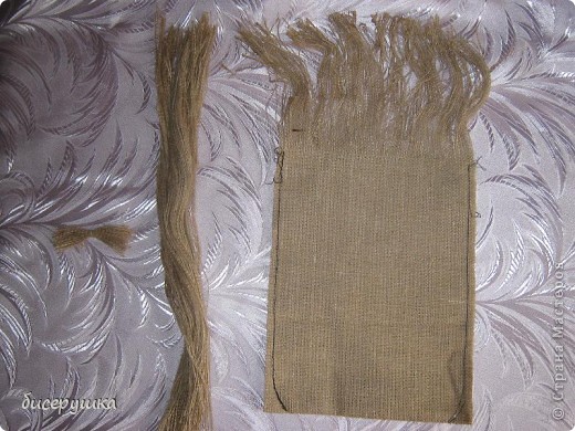 Итак, приступаем к работе: нам понадобится мешковина или новый мешок, который мы распорим и сделаем заготовки для домовёнка . Для туловища с головой вырезаем прямоугольник (у меня он 20 х 85 см.), сложим его пополам и прошиваем боковые швы, заокруглив немножко внизу, вытянуть вверху нитки сантиметров 14 для формирования волос, а те, что вытянули пойдут на изготовление усов. С остальной мешковины нужно наторочить нитки подлинее для формирования бороды , примерно 45 см. , и ещё нужно сделать заготовочку для бровей, где-то 7-8 см. длиной