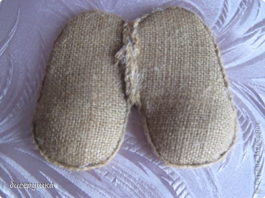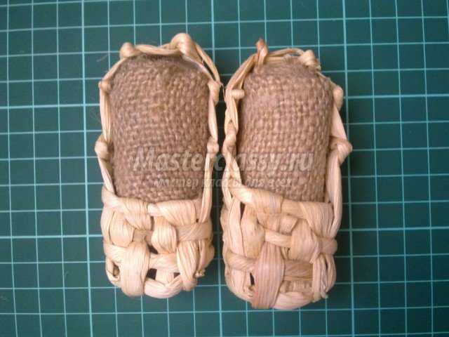 Лапотки. Можно связать из того же шпагата. Я нашла дома готовые, из кукурузных листьев. Моему домовёнку будут в самую пору! Заполняю лапотки скруткой из мешковины. “Прихватываю” её на клей, чтобы не выпала. Затем прикрепляю лапотки к донышку мешка.