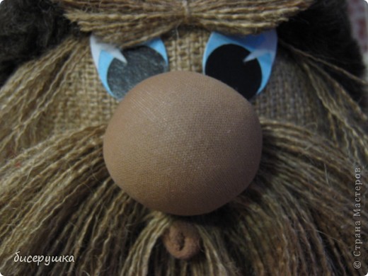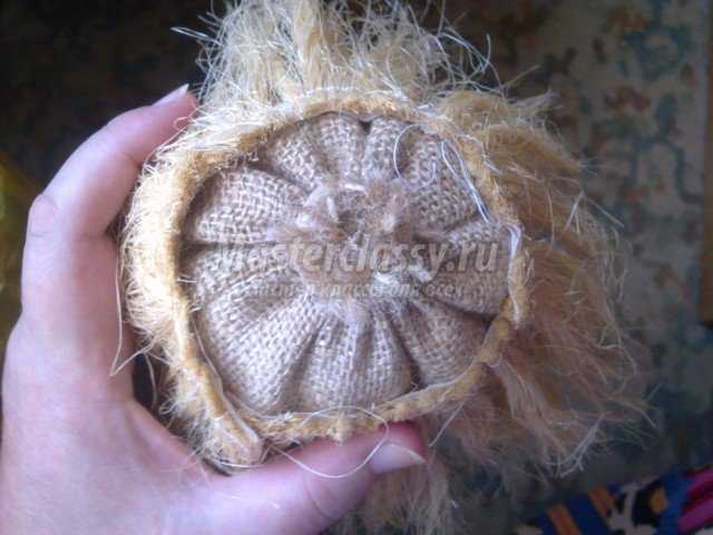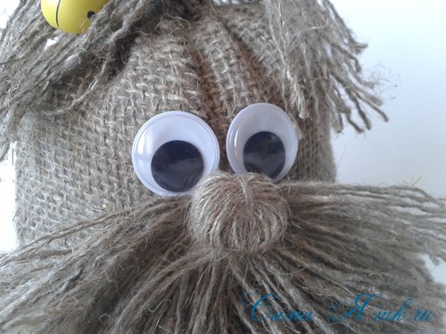 Из вытянутых нитей мешковины делаем бороду: связываем посередине, а затем по кругу, оформляя носик. Выравниваем край.