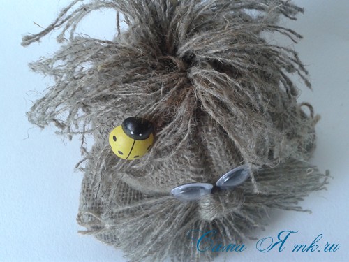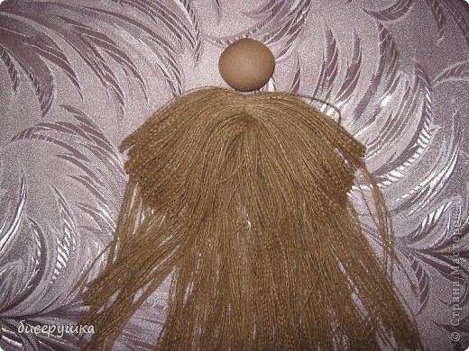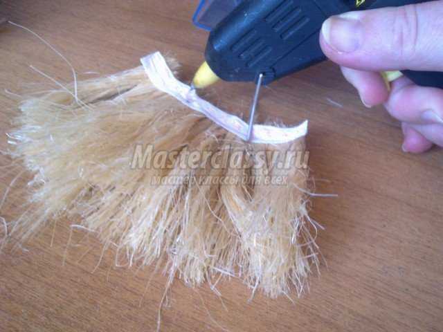 Если нет такой кисти, можно сделать волосы из шпагата. Получается очень даже неплохо! Приклеиваем получившийся “паричок” с помощью термопистолета. Это быстро и удобно