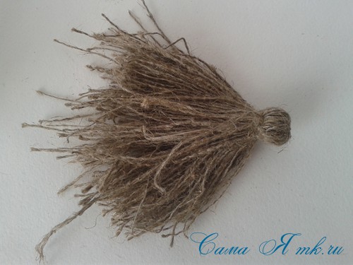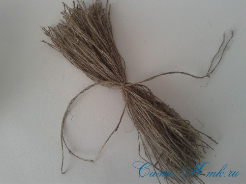 Усы делаем из льняной пакли. Очень просто. Взяли немного пакли, туго перетянули посередине, подстригли края, чтобы подровнять и придать форму усам. Нитку желательно подобрать в тон пакле.