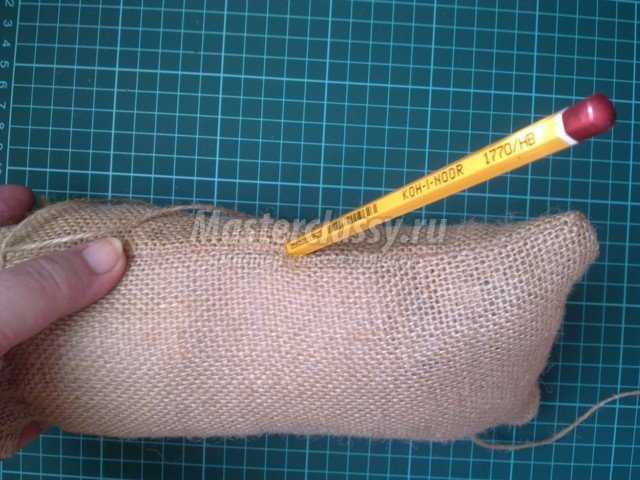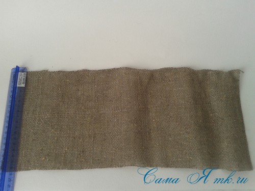 Из мешковины вырезаем прямоугольник, размер которого зависит от размеры игрушки. У меня получился 18х45 см.