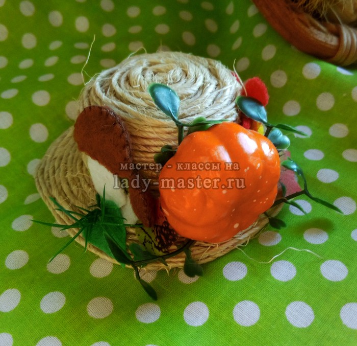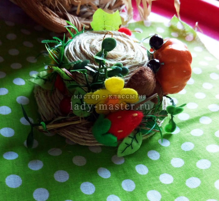 Я использовала готовые декоративные листья. Также несколько листьев и цветов я вырезала из фетра. Грибы и ягоды тоже изготовлены из фетра. Тыква и зеленая травка – готовые пластмассовые. Еще я использовала бусины и сухую траву.