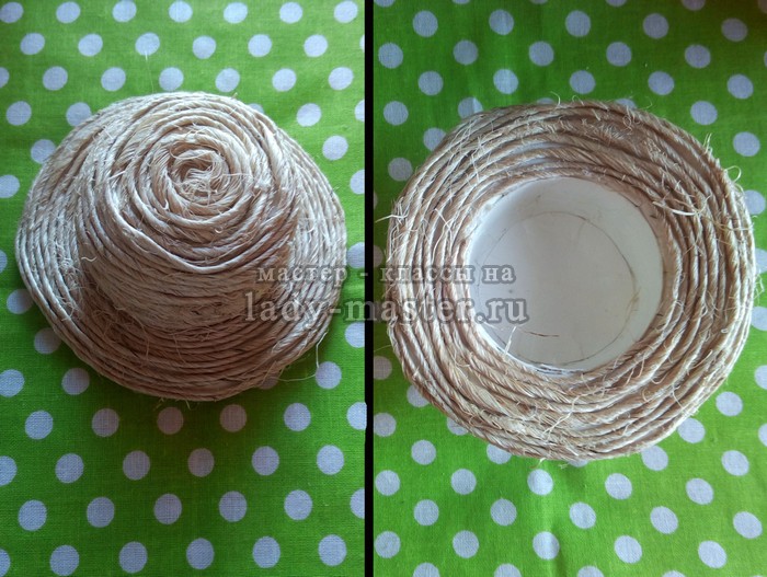 Так двигаюсь к полям шляпы. Поля оклеиваю джутовой нитью и с верхней, и с нижней стороны. Если что-то получилось небрежно, не переживайте, потом это можно будет замаскировать украшениями.