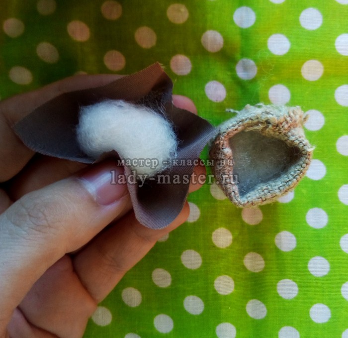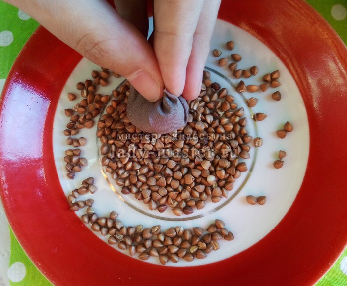 Наполняю их до половины синтепоном. Потом вырезаю кусочек любой ткани, набиваю его синтепоном и сворачиваю. Сверху ткань обильно смазываю супер-клеем и опускаю в зерно. Крупинки должны приклеиться к ткани.