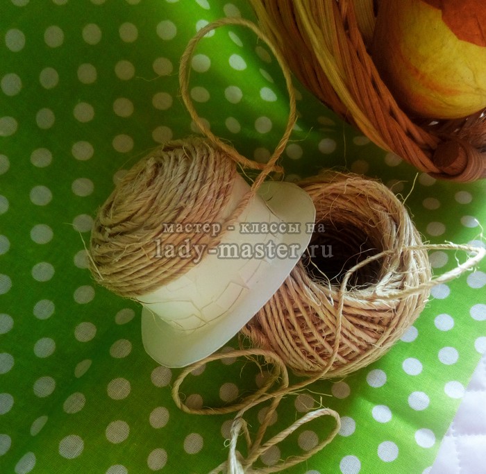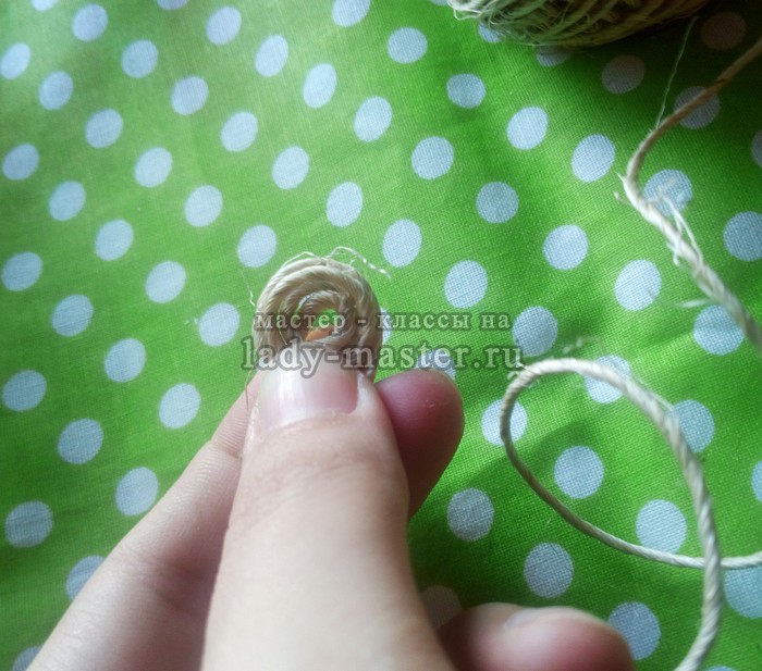 И пусть шляпа получится не очень аккуратной, ведь домовята – они такие, слегка растрепанные, слегка небрежные. Теперь я беру джутовую нить и скручивая небольшую «улиточку».