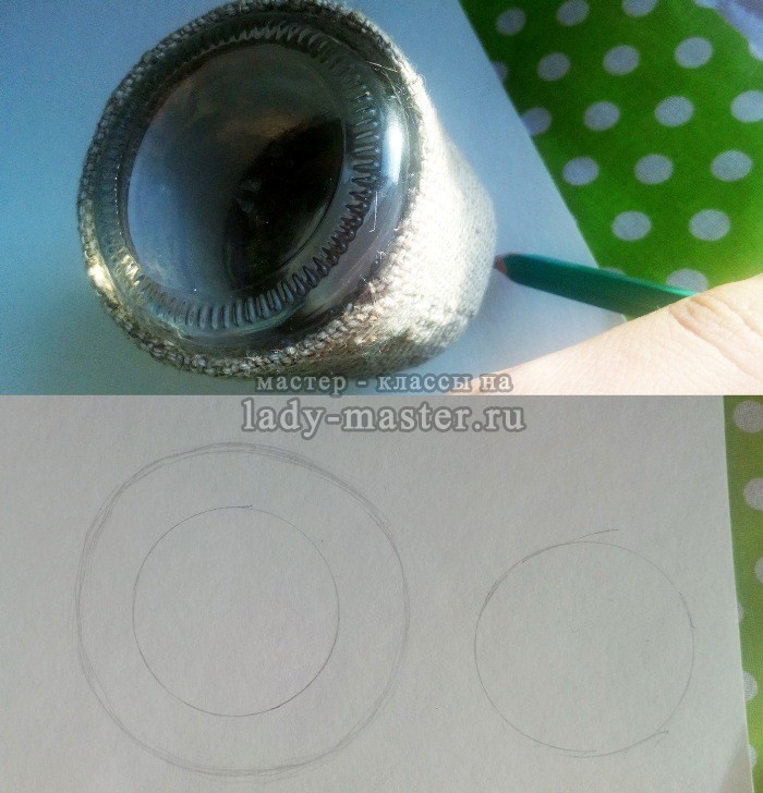 Тот круг, который будет верхом шляпы можно вырезать поменьше. А вот вокруг второго круга я рисую поля шляпы и вырезаю отверстие в круге, но меньше, чем сама окружность. В этом заделе делаю надрезы и загибаю их. Вырез шляпы должен быть таким, чтобы в него легко проходила горловина баночки.