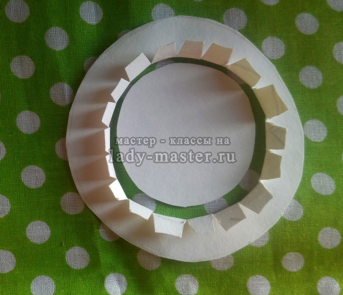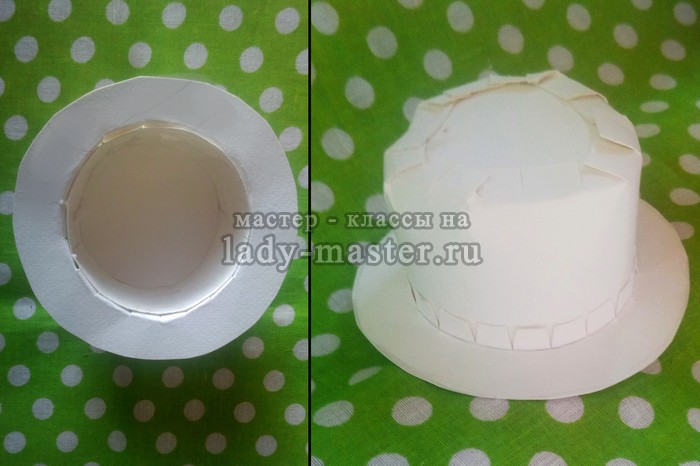 Теперь поля шляпы и верх нужно скрепить. Для этого вырезаю прямоугольник, длина которого равна длине окружности вырезанного круга. Высота прямоугольника – 2-3 см. Сверху тоже делаю надрезы. Теперь скрепляю все три детали супер-клеем.