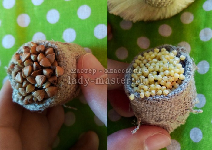 Поочерёдно “варим” кашку. Смешиваем небольшое количество крупы с клеем ПВА и заполняем этой смесью верхушку мешочка. Побольше, чтобы “с горкой”! Смесь сначала от клея становится белой, но пусть вас это не пугает, минут через 10-15 клей становится прозрачным, а крупинки хорошо склеиваются между собой. Потом, после полного высыхания их можно вскрыть 2-3 слоями бесцветного лака. Ну очень красиво смотрится, блестит и жучки лак с клеем не очень-то любят! Готовые мешочки приклеиваем сзади, на спинке домового. Можно было каждый мешочек привязать кусочком шпагата, но я как-то сразу об этом не подумала, а уж когда приклеила.