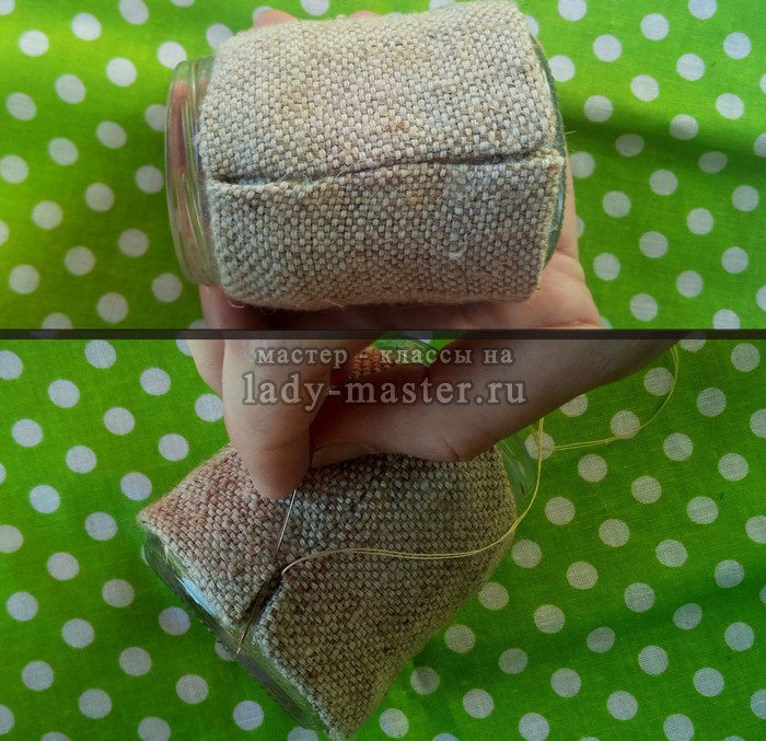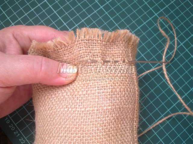 Складываем заготовку пополам и, отступив от края мешковины 1.5 см, прошиваем боковые края вручную или на машинке, закругляя нижние уголки.