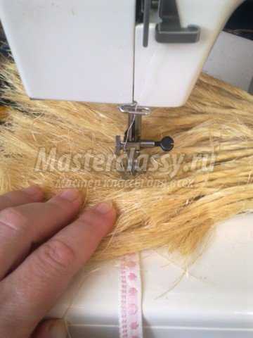 Волосы делаем из травяной кисти. Чтобы их легче было прикреплять к голове нашего героя, я прострачиваю эти волокна на машинке, подложив снизу тесьму