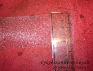 А пока нарезаем органзу. Органза должна быть флористическая, она на осыпается. Я нарезаю сначала лентами, шириной примерно 4,5 см, за тем квадратиками 4,5*4,5 см.