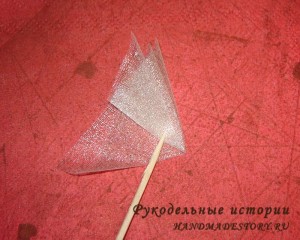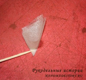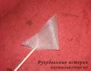 Т.е складываем как фунтик для букета из конфет. Далее наносим капельку горячего клея на заготовку.
