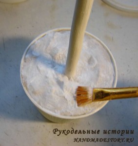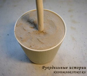 У меня органза цвета «шампань» (почти белая) поэтому я остановилась на этом. Если органза другого цвета, например красная, нужно обмотать заготовку красной салфеткой, чтобы в готовом виде не просвечивала белая основа. Дальше закрепляем ствол в горшке. Как это сделать писала в статье Как сделать топиарий. Напомню вкратце. Гипс разводим холодной водой до состояния полужидкой сметаны, перекладываем смесь в горшок и быстренько вставляем стебель. Выравниваем и ждем, пока застынет. Гипс схватывается очень быстро, при застывании он разогревается. Когда остынет можно работать с топиарием дальше.