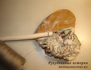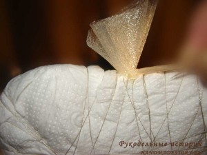 Так поступаем с заготовкой со всех сторон. Дальше, чтобы выровнять поверхность, обмотала заготовку туалетной бумагой и закрепила нитками.