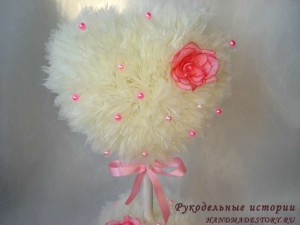 После высыхания клея можно продолжать работу. После заполнения всего пространства горшка фунтиками можно приступать к самой приятной части изготовления топиария. Украшаем сердце розочкой, и бусинами. На стволик завяжем бантик из атласной ленточки.