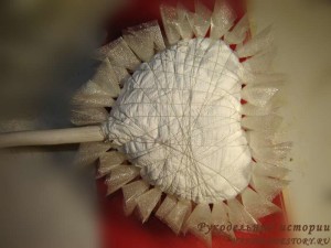 Делаем серединку — например, комкаем фольгу или старую газету, обматываем ниточками, чтоб получилась плотная форма. Можно обмотать её лентой, но необходимости нет — розы из атласа получаются довольно пышными.