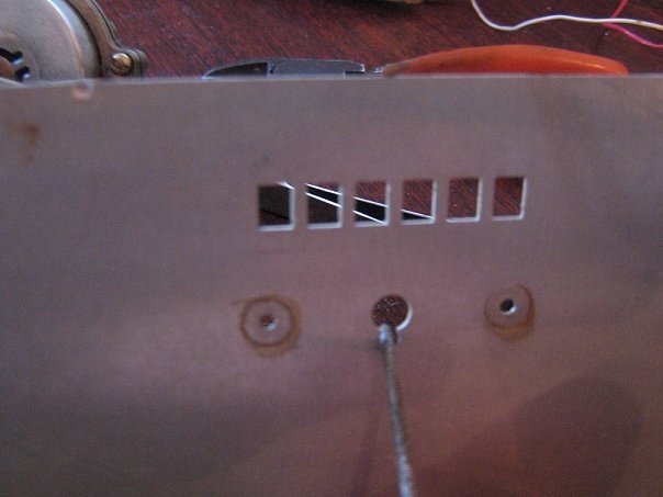 - Диод крепится между черной накладкой и шкалой. Для чего берем дрель и сверло диаметром 7 миллиметров, сверлим отверстие в низу шкалы.