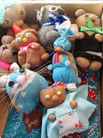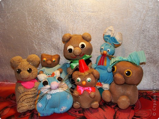 Изготовление однотипных игрушек с использованием различного материала (носочки их искуственного мариала и мохнатые шерстяные, носочки- гольфики капроновые) и набитых ватой, синтепоном, опилками позволяет создать фигурки с индивидуальными чертами характера.