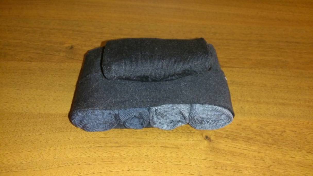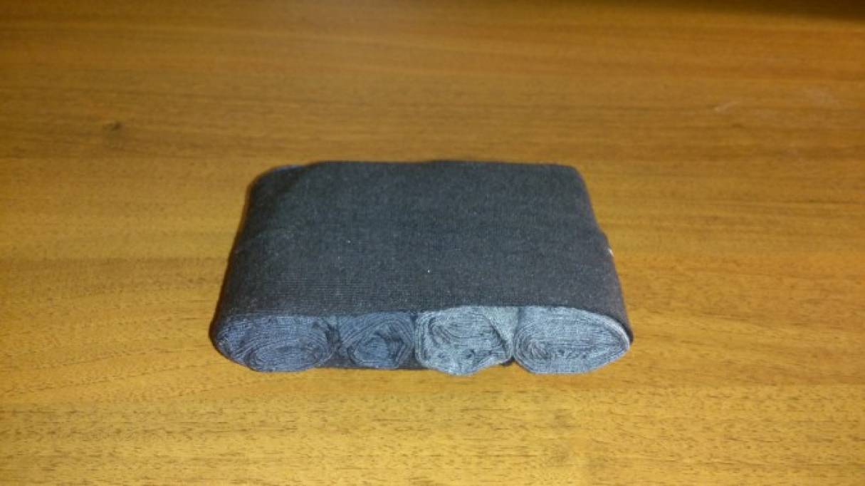 Заворачиваем все 4 серых рулончика, поместив их в 1 черный носок по центру так, чтобы часть носка, в котором располагаются пальцы ступни вошел в резинку этого носка. Вот так: